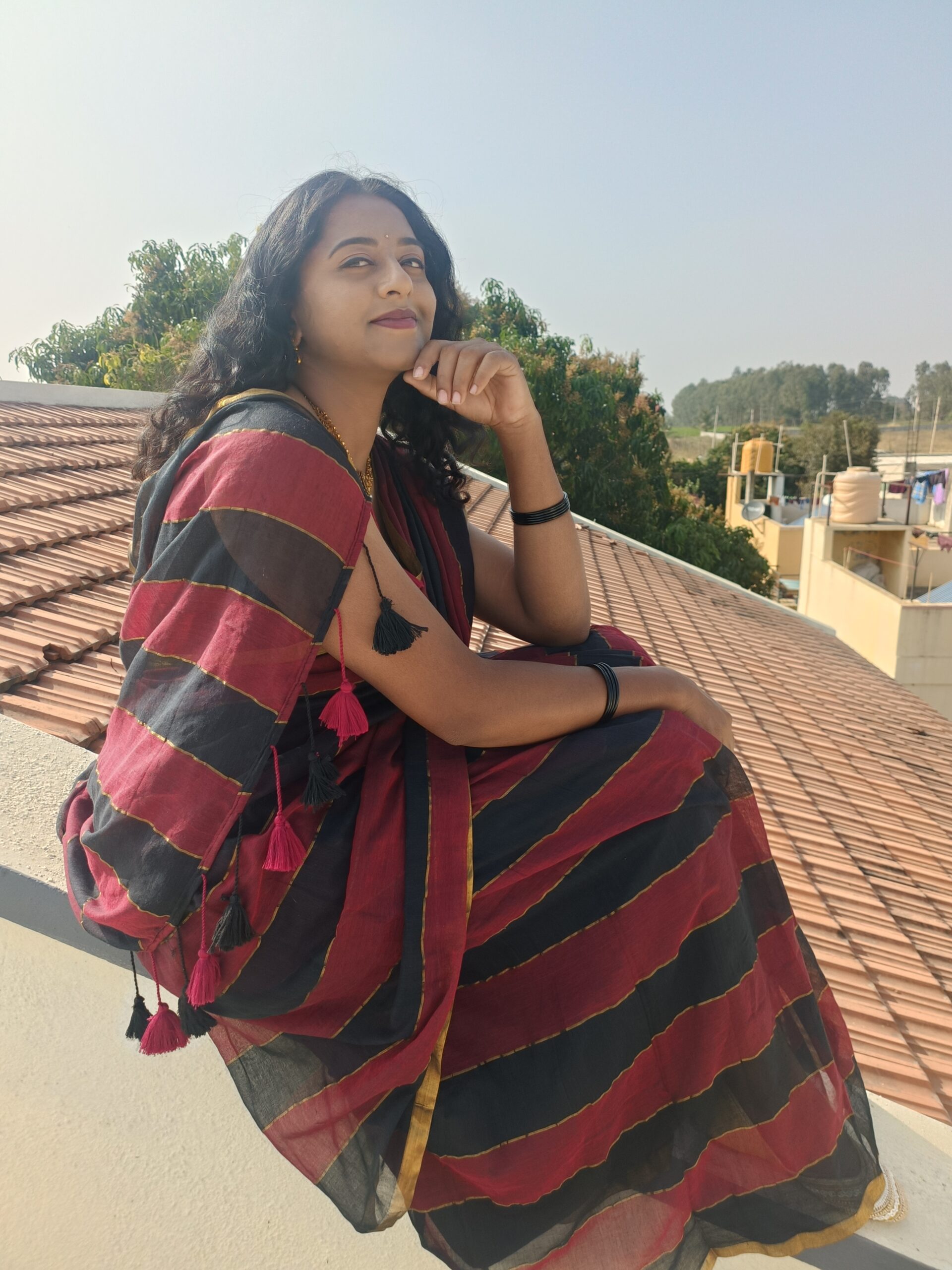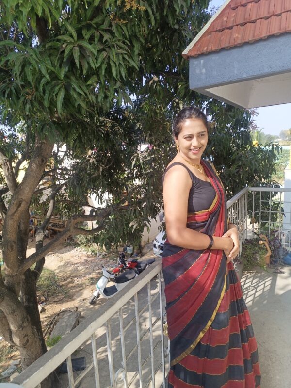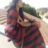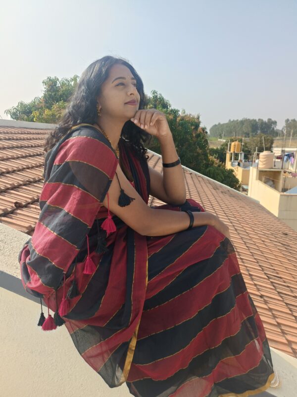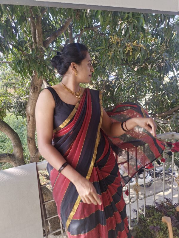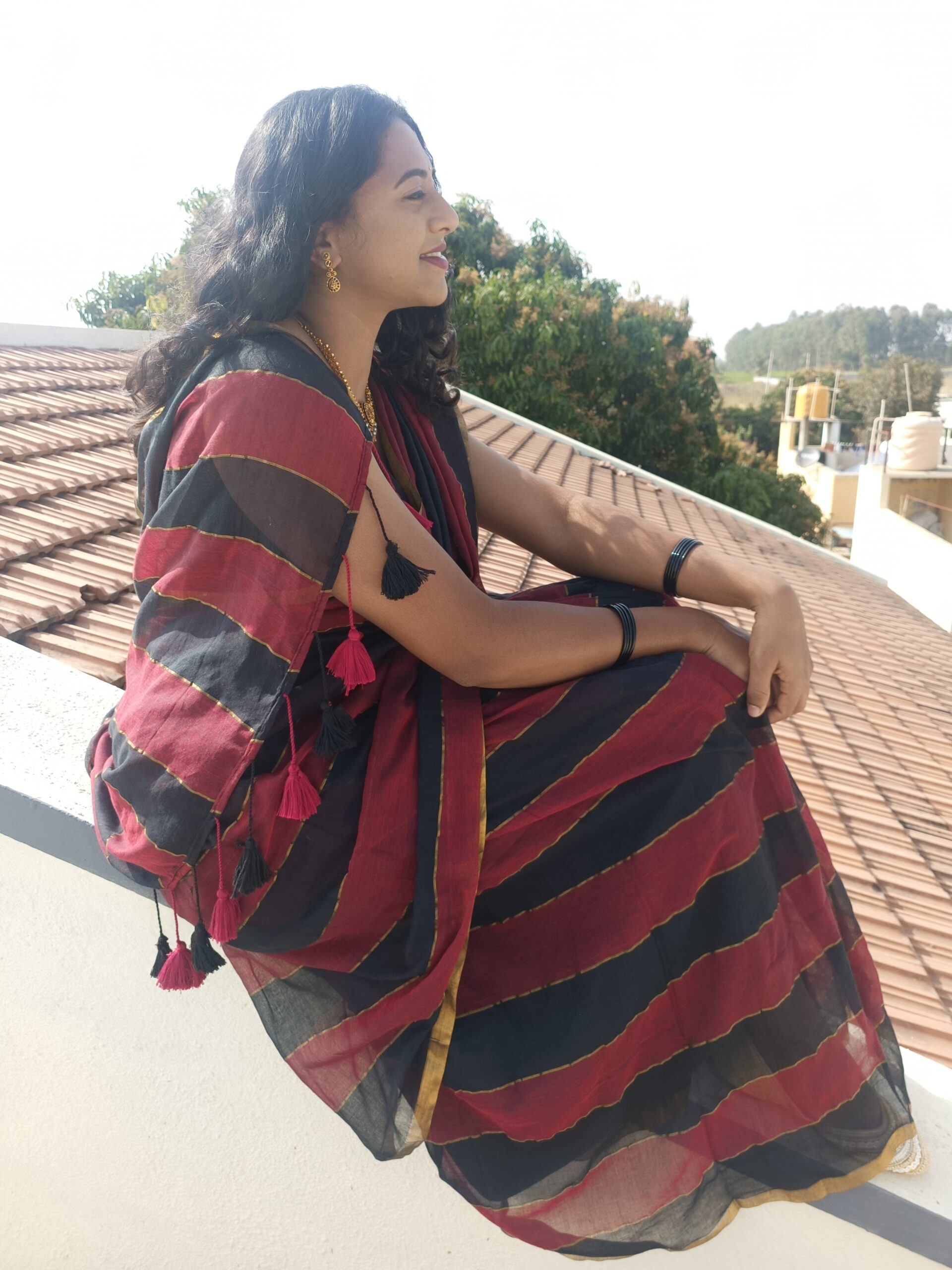 Bring home timeless elegance with this Red and Black Mul Cotton Saree, beautifully enhanced with golden zari stripes and a classic zari border. Crafted from soft, breathable mul cotton, this saree offers all-day comfort while maintaining a rich, graceful look. The striking contrast of red and black paired with subtle zari detailing makes it perfect for both everyday elegance and festive occasions.